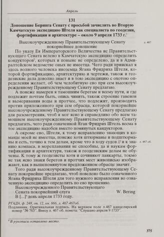 Доношение Беринга Сенату с просьбой зачислить во Вторую Камчатскую экспедицию Штеля как специалиста по геодезии, фортификации и архитектуре. Около 9 апреля 1733 г.