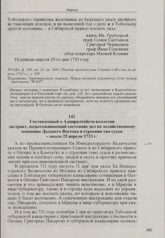 Составленный в Адмиралтейств-коллегии экстракт, подытоживающий состояние дел по хозяйственному освоению Дальнего Востока и строении там судов. Около 25 апреля 1733 г. // РГАВМФ, ф. 212, оп. 11, д. 661, л. 103-120.