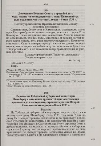 Доношение Беринга Сенату с просьбой дать указ, можно ли экспедиции ехать через Екатеринбург, если окажется, что этот путь лучше. 8 мая 1733 г. // РГАДА, ф. 248, оп. 12, кн. 664, л. 234.