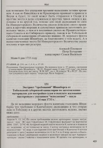 Экстракт «требований» Шпанберга от Тобольской губернской канцелярии по заготовлению материалов для постройки судов и выплате жалования мастеровым с указанием «исполнения». 14 мая 1733 г.