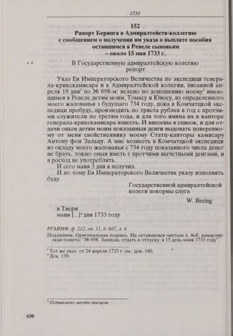 Рапорт Беринга в Адмиралтейств-коллегию с сообщением о получении им указа о выплате пособия оставшимся в Ревеле сыновьям. Около 15 мая 1733 г. // РГАВМФ, ф. 212, оп. 11, д. 667, л. 4.