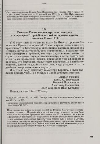 Решение Сената о процедуре оплаты подвод для офицеров Второй Камчатской экспедиции, едущих с семьями. 18 мая 1733 г. // РГАДА, ф. 248, оп. 32. кн. 2050 (Реестр крепленым протоколам Сената за май 1733 г.), л. 165.
