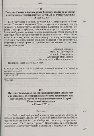 Решение Сената о выдаче указа Берингу, чтобы он следовал в экспедицию тем маршрутом, который он считает лучшим. 18 мая 1733 г. // РГАДА, ф. 248, оп. 32. кн. 2050 (Реестр крепленым протоколам Сената за май 1733 г.), л. 169.