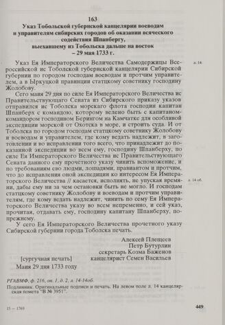 Указ Тобольской губернской канцелярии воеводам и управителям сибирских городов об оказании всяческого содействия Шпанбергу, выехавшему из Тобольска дальше на восток. 29 мая 1733 г. // РГАВМФ, ф. 216, оп. 1, д. 2, л. 14-14об.