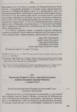 Доношение Беринга Сенату с просьбой назначить двойное жалованье пастору Милиесу. 4 июня 1733 г. // РГАДА, Ф 248, оп. 12, кн. 664, л. 257-257об.
