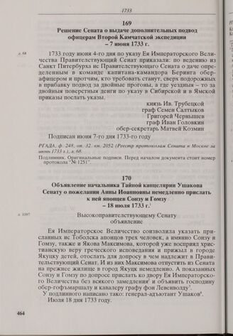 Решение Сената о выдаче дополнительных подвод офицерам Второй Камчатской экспедиции. 7 июня 1733 г.
