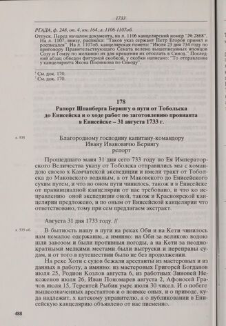 Рапорт Шпанберга Берингу о пути от Тобольска до Енисейска и о ходе работ по заготовлению провианта в Енисейске. 31 августа 1733 г. // РГАДА, ф. 248, оп. 4, кн. 160, л. 535-541.