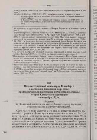 Ведение Илимской канцелярии Шпанбергу о состоянии дощаников на р. Лене, предназначенных для сплавки имущества и команды Второй Камчатской экспедиции. 6 октября 1733 г. // РГАВМФ, ф. 216, оп. 1, д. 6, л. 173-174.