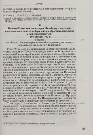 Ведение Илимской канцелярии Шпанбергу о послании дополнительных сил для сбора доимок оброчного провианта с пашенных крестьян. 10 октября 1733 г. // РГАВМФ, ф. 216, оп. 1, д. 6, л. 187-187об.