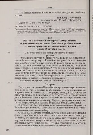 Рапорт и экстракт Шпанберга в Адмиралтейств-коллегию о путешествии от Енисейска до Илимска и о заготовке провианта местными канцеляриями. Около 13 октября 1733 г. // РГАДА, ф. 248, оп. 4, кн. 160, л. 566-571.