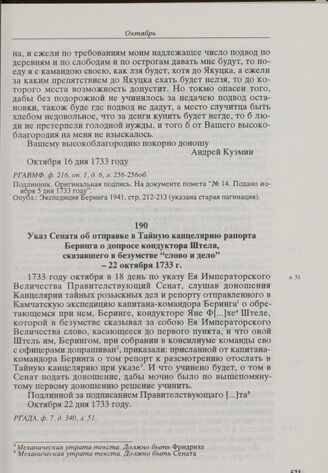 Указ Сената об отправке в Тайную канцелярию рапорта Беринга о допросе кондуктора Штеля, сказавшего в безумстве «слово и дело». 22 октября 1733 г. // РГАДА, ф. 7, д. 340, л. 51.