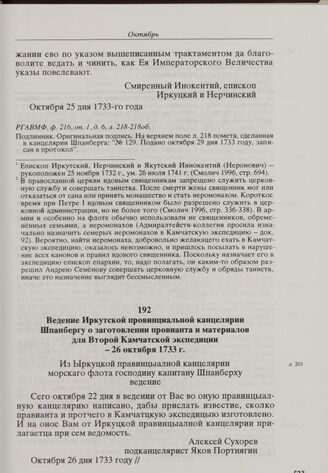 Ведение Иркутской провинциальной канцелярии Шпанбергу о заготовлении провианта и материалов для Второй Камчатской экспедиции. 26 октября 1733 г. // РГАВМФ, ф. 216, оп. 1, д. 6, л. 201-206об.