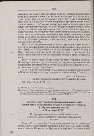 Ведение Иркутской провинциальной канцелярии Шпанбергу с объяснением, откуда у посадского человека Г. Мутина кричное железо. 31 октября 1733 г. // РГАВМФ, ф. 216, оп. 1, д. 6, л. 220-220об.