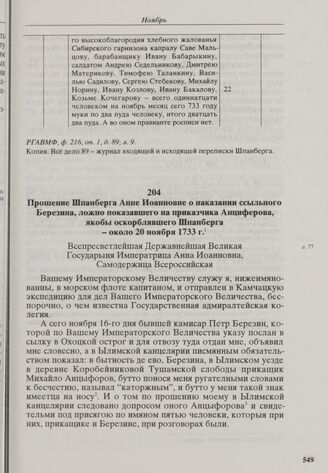 Прошение Шпанберга Анне Иоанновне о наказании ссыльного Березина, ложно показавшего на приказчика Анциферова, якобы оскорблявшего Шпанберга. Около 20 ноября 1733 г. // РГАВМФ, ф. 216, оп. 1, д. 58, л. 77-77об.
