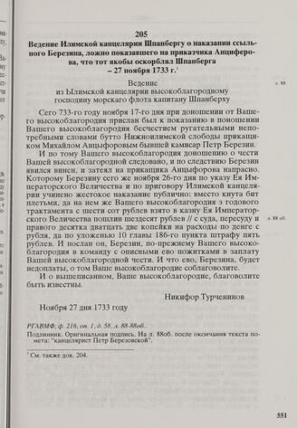 Ведение Илимской канцелярии Шпанбергу о наказании ссыльного Березина, ложно показавшего на приказчика Анциферова, что тот якобы оскорблял Шпанберга. 27 ноября 1733 г. // РГАВМФ, ф. 216, оп. 1, д. 58, л. 88-88об.