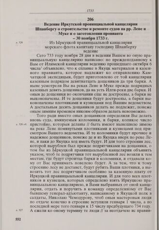 Ведение Иркутской провинциальной канцелярии Шпанбергу о строительстве и ремонте судов на рр. Лене и Муке и о заготовлении провианта. 30 ноября 1733 г. // РГАВМФ, ф. 216, оп. 1 ,д. 6, л. 326-328об.