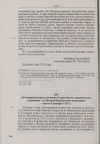 Договорной подряд плотника Скуратова на строительство дощаников для Второй Камчатской экспедиции. Около 4 декабря 1733 г. // РГАДА, ф. 248, оп. 4, кн. 160, л. 565-565об.