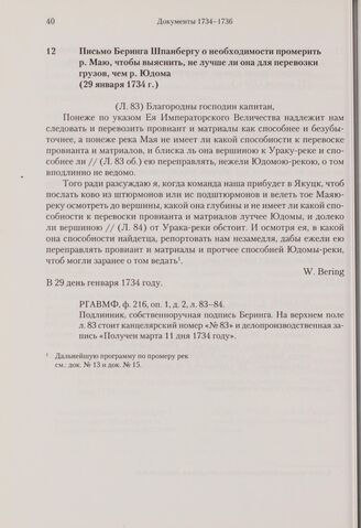 Письмо Беринга Шпанбергу о необходимости промерить р. Маю, чтобы выяснить, не лучше ли она для перевозки грузов, чем р. Юдома. 29 января 1734 г.