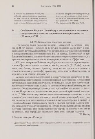 Сообщение Беринга Шпанбергу о его переписке с местными канцеляриями о заготовке провианта и о перевозке скота. 29 января 1734 г. // РГАВМФ, ф. 216, оп. 1, д. 2, л. 89-90.