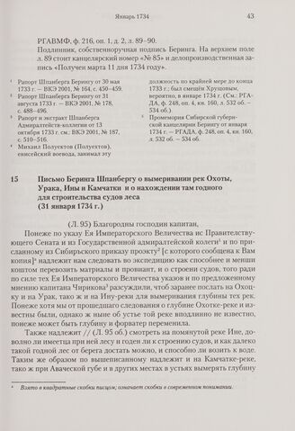 Письмо Беринга Шпанбергу о вымеривании рек Охоты, Урака, Ины и Камчатки и о нахождении там годного для строительства судов леса. 31 января 1734 г. // РГАВМФ, ф. 216, оп. 1, д. 2, л. 95-96.