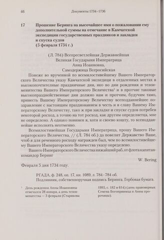 Прошение Беринга на высочайшее имя о пожаловании ему дополнительной суммы на отмечание в Камчатской экспедиции государственных праздников и закладки и спуска судов. 5 февраля 1734 г. // РГАДА, ф. 248, оп. 17, кн. 1089, л. 784-784 об.
