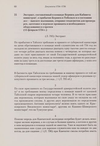 Экстракт, составленный в команде Беринга для Кабинета министров, о прибытии Беринга в Тобольск и о состоянии дел — выплате жалования, отправке геодезистов для промера рек, заготовке и перевозе провианта и необходимого оборудования и о прочем. 15 февраля 1734 г. // РГАДА, ф. 248, оп. 17, кн. 1089, л. 795-799.
