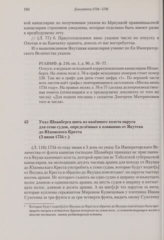 Указ Шпанберга шить из казенного холста паруса для семи судов, определенных к плаванию от Якутска до Юдомского Креста. 3 июня 1734 г. // РГАВМФ, ф. 216, оп. 1, д. 30, л. 118-118 об.