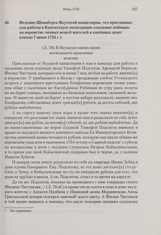 Ведение Шпанберга Якутской канцелярии, что присланные для работы в Камчатскую экспедицию ссыльные пойманы на воровстве личных вещей жителей и казенных денег. Около 7 июня 1734 г. // РГАВМФ, ф. 216, оп. 1, д. 90, л. 78-79.