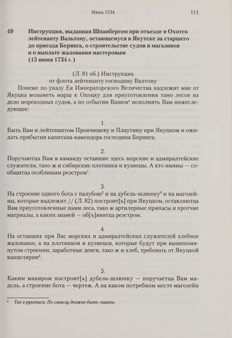 Инструкция, выданная Шпанбергом при отъезде в Охотск лейтенанту Вальтону, остающемуся в Якутске за старшего до приезда Беринга, о строительстве судов и магазинов и о выплате жалования мастеровым. 15 июня 1734 г.