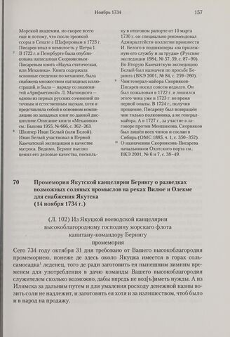 Промемория Якутской канцелярии Берингу о разведках возможных соляных промыслов на реках Вилюе и Олекме для снабжения Якутска. 14 ноября 1734 г. // ПФА РАН, ф. 21, оп. 5, д. 73, л. 102-105.