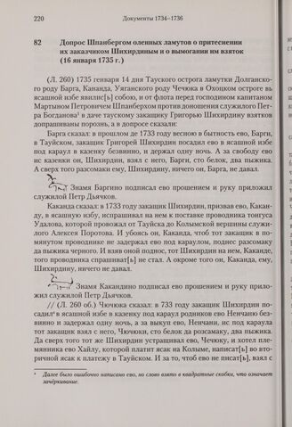 Допрос Шпанбергом оленных ламутов о притеснении их заказчиком Шихирдиным и о вымогании им взяток. 16 января 1735 г. // РГАВМФ, ф. 216, оп. 1, д. 19, л. 260-261 об.