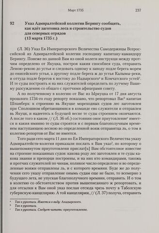 Указ Адмиралтейской коллегии Берингу сообщить, как идет заготовка леса и строительство судов для северных отрядов. 13 марта 1735 г. // РГАВМФ, ф. 216, оп. 1, д. 22, л. 36-37.