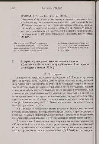 Экстракт о разведении скота местными жителями в Охотске и на Камчатке для нужд Камчатской экспедиции. Не позднее 1 апреля 1735 г. // РГАВМФ, ф. 216, оп. 1, д. 12, л. 3-6.