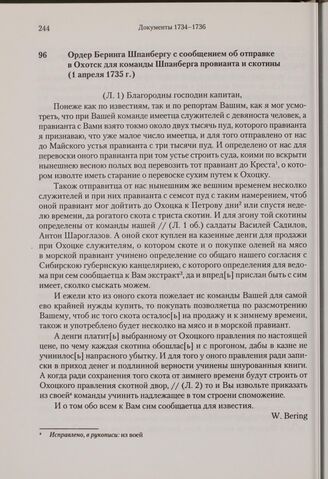 Ордер Беринга Шпанбергу с сообщением об отправке в Охотск для команды Шпанберга провианта и скотины. 1 апреля 1735 г.