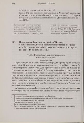 Промемория Делиля де ла Кройера Берингу с объяснениями, почему невозможно прислать ни одного из трех геодезистов, работающих в академическом отряде. Не ранее 14 сентября 1735 г. // ПФА РАН, ф. 21, оп. 5, д. 62, л, 35-35 об.