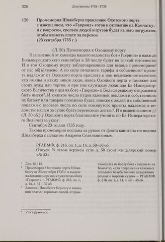 Промемория Шпанберга правлению Охотского порта с извещением, что «Гавриил» готов к отплытию на Камчатку, и с вопросом, сколько людей и грузов будет на него погружено, чтобы взимать плату за перевоз. 23 сентября 1735 г. // РГАВМФ, ф. 216, оп. 1, д. 14, л. 50-50 об.