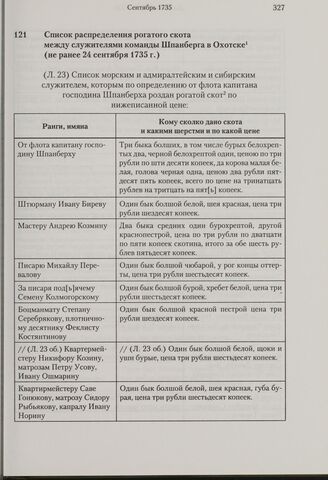 Список распределения рогатого скота между служителями команды Шпанберга в Охотске. Не ранее 24 сентября 1735 г. // РГАВМФ, ф. 216, оп. 1, д. 12, л. 23-25.