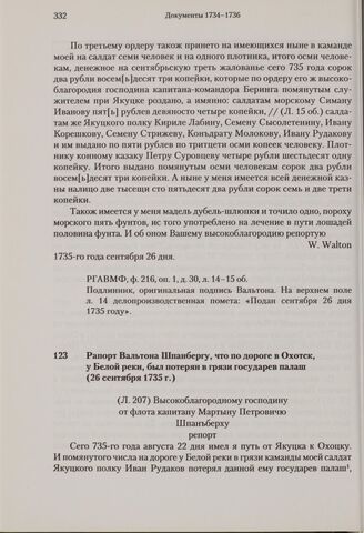Рапорт Вальтона Шпанбергу, что по дороге в Охотск, у Белой реки, был потерян в грязи государев палаш. 26 сентября 1735 г. // РГАВМФ, ф. 216, оп. 1, д. 14, л. 207.