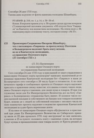 Промемория Скорнякова-Писарева Шпанбергу, что с пассажиров «Гавриила» за проезд между Охотском и Большерецком надлежит брать плату мехами, но не в Камчатскую экспедицию, а в правление Охотского порта. 27 сентября 1735 г.