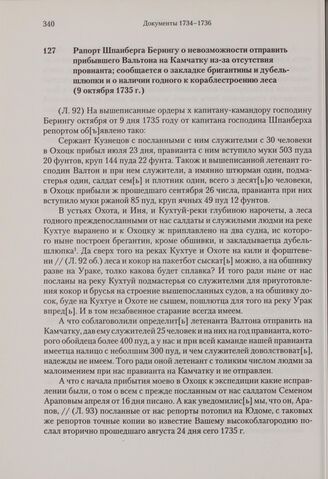Рапорт Шпанберга Берингу о невозможности отправить прибывшего Вальтона на Камчатку из-за отсутствия провианта; сообщается о закладке бригантины и дубель-шлюпки и о наличии годного к кораблестроению леса. 9 октября 1735 г.