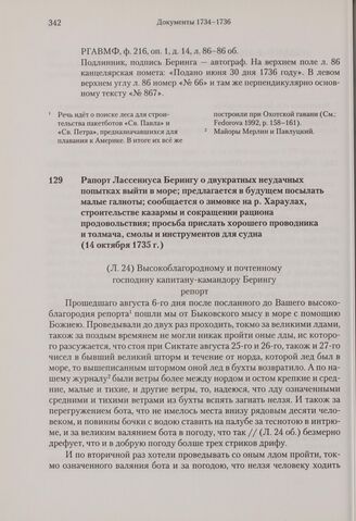 Рапорт Лассениуса Берингу о двукратных неудачных попытках выйти в море; предлагается в будущем посылать малые галиоты; сообщается о зимовке на р. Хараулах, строительстве казармы и сокращении рациона продовольствия; просьба прислать хорошего проводника и толмача, смолы и инструментов для судна. 14 октября 1735 г. // РГАВМФ, ф. 216, оп. 1, д. 24, л. 24-28.