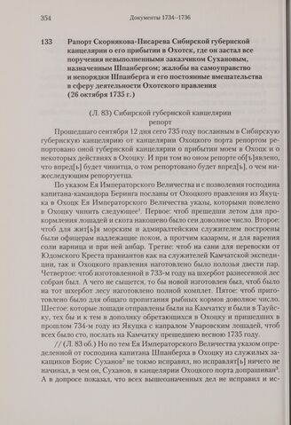 Рапорт Скорнякова-Писарева Сибирской губернской канцелярии о его прибытии в Охотск, где он застал все поручения невыполненными заказчиком Сухановым, назначенным Шпанбергом; жалобы на самоуправство и непорядки Шпанберга и его постоянные вмешательства в сферу деятельности Охотского правления. 26 октября 1735 г. // РГАВМФ, ф. 216, оп. 1, д. 34, л. 83-86.