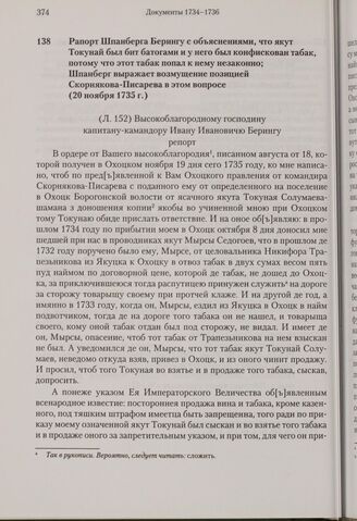 Рапорт Шпанберга Берингу с объяснениями, что якут Токунай был бит батогами и у него был конфискован табак, потому что этот табак попал к нему незаконно; Шпанберг выражает возмущение позицией Скорнякова-Писарева в этом вопросе. 20 ноября 1735 г. // РГАВМФ, ф. 216, оп. 1, д. 14, л. 152-153 об.