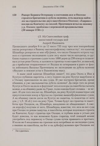Рапорт Беринга Остерману о состоянии дел: в Охотске строятся бригантина и дубель-шлюпка, есть надежда найти лес на строительство двух пакетботов в Охотске; «Гавриил» послан на Камчатку за смолой; Прончищев встал на зимовку у р. Оленек; проблемы с перевозкой продовольствия. 30 января 1736 г. // АВПРИ, ф. 130, оп. 130/1, д. 4, л. 16-19.