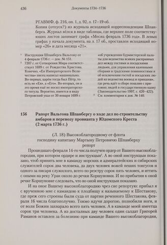 Рапорт Вальтона Шпанбергу о ходе дел по строительству амбаров и перевозу провианта у Юдомского Креста. 2 марта 1736 г. // РГАВМФ, ф. 216, оп. 1, д. 17, л. 18-19 об.