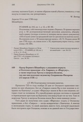 Ордер Беринга Шпанбергу с указанием вернуть в Охотское правление «Св. Гавриил» и «Фортуну», а также морехода Треску и матроса Беляева, так как они подлежат ведомству Скорнякова-Писарева. 12 апреля 1736 г. // РГАВМФ, ф. 216, оп. 1, д. 14, л. 98-98 об.