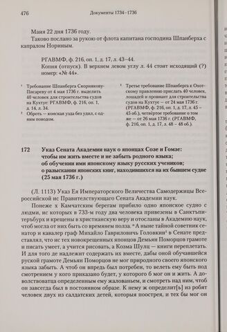 Указ Сената Академии наук о японцах Созе и Гомзе: чтобы им жить вместе и не забыть родного языка; об обучении ими японскому языку русских учеников; о разыскании японских книг, находившихся на их бывшем судне. 25 мая 1736 г. // РГАДА, ф. 248, оп. 4, кн. 164, л. 1113-1114.