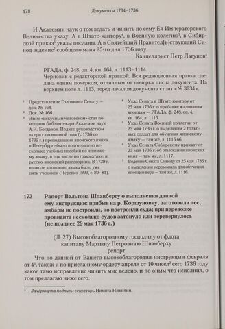 Рапорт Вальтона Шпанбергу о выполнении данной ему инструкции: прибыв на р. Коршуновку, заготовили лес; амбары не построили, но построили суда; при перевозке провианта несколько судов затонуло или перевернулось. Не позднее 29 мая 1736 г.