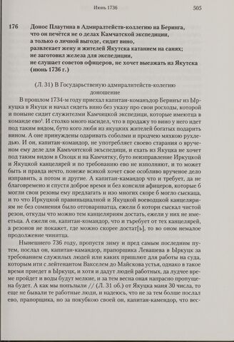 Донос Плаутина в Адмиралтейств-коллегию на Беринга, что он печется не о делах Камчатской экспедиции, а только о личной выгоде, сидит вино, развлекает жену и жителей Якутска катанием на санях; не заготовил железа для экспедиции, не слушает советов офицеров, не хочет выезжать из Якутска. Июнь 1736 г. // РГАВМФ, ф. 216, оп. 1, д. 15, л. 31-34.
