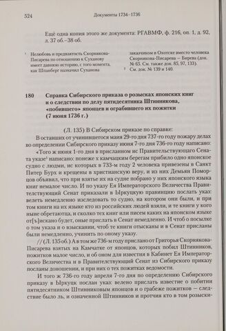 Справка Сибирского приказа о розысках японских книг и о следствии по делу пятидесятника Штинникова, «побившего» японцев и ограбившего их пожитки. 7 июня 1736 г. // РГАВМФ, ф. 216, оп. 1, д. 49, л. 135-136.